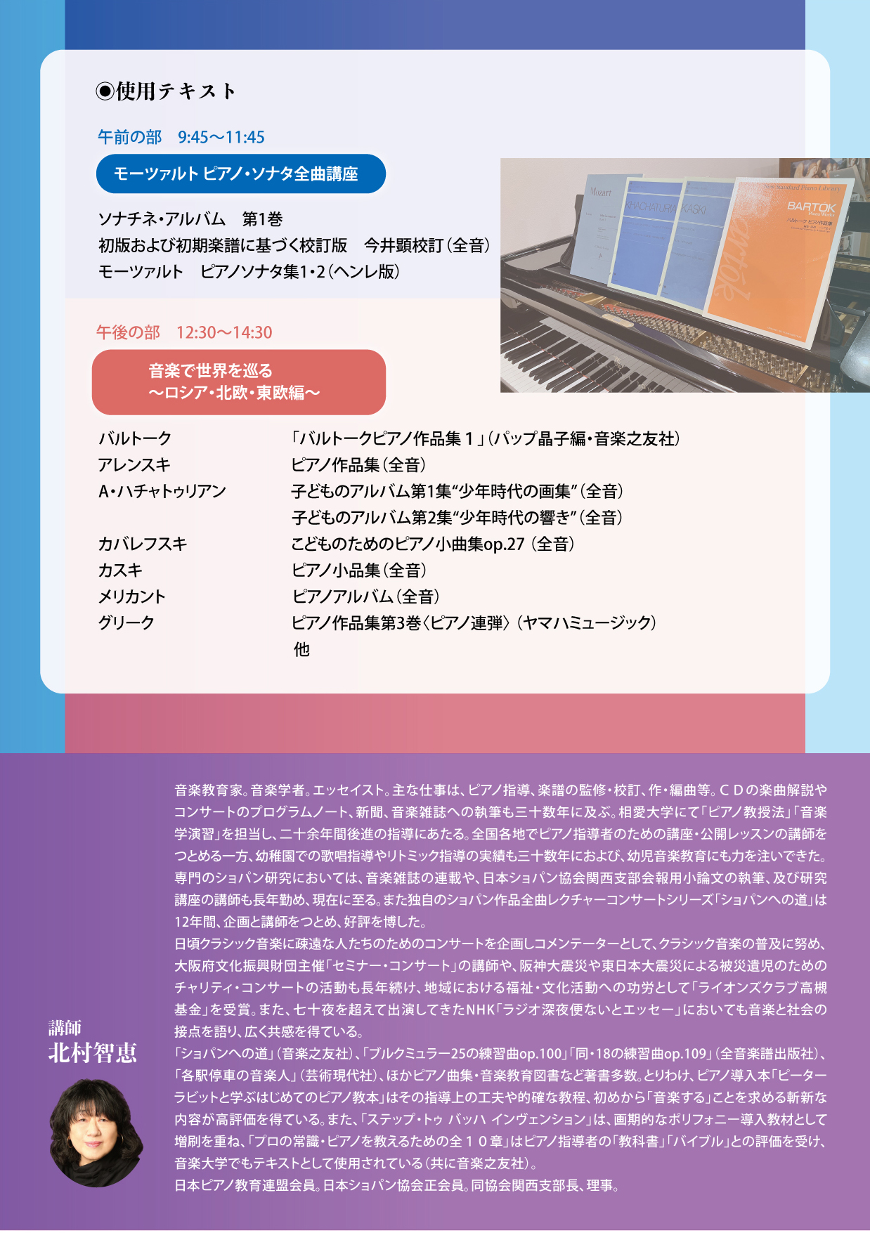 日本のピアノ教育において、まだまだメジャーにはなっていないロシア、北欧、東欧の作曲家のピアノ作品の中から、日頃のレッスンでぜひとも子ども達に出会わせたい作曲家と作品についてレクチャーし、その指導のポイントをお伝えする講座です。